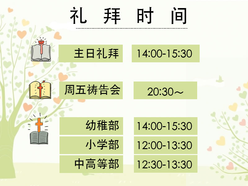信仰告白我信上帝,全能的父,是创造天地的主。 教会异象中国宣教,世界宣教 牧会哲学日常的基督徒,耶稣的门徒,拥抱这个世界的基督徒 家里教会关于家里教会 中文部礼拜 韩国部礼拜 日本部礼拜 中 高 等 部 小 学 部 幼 稚 部